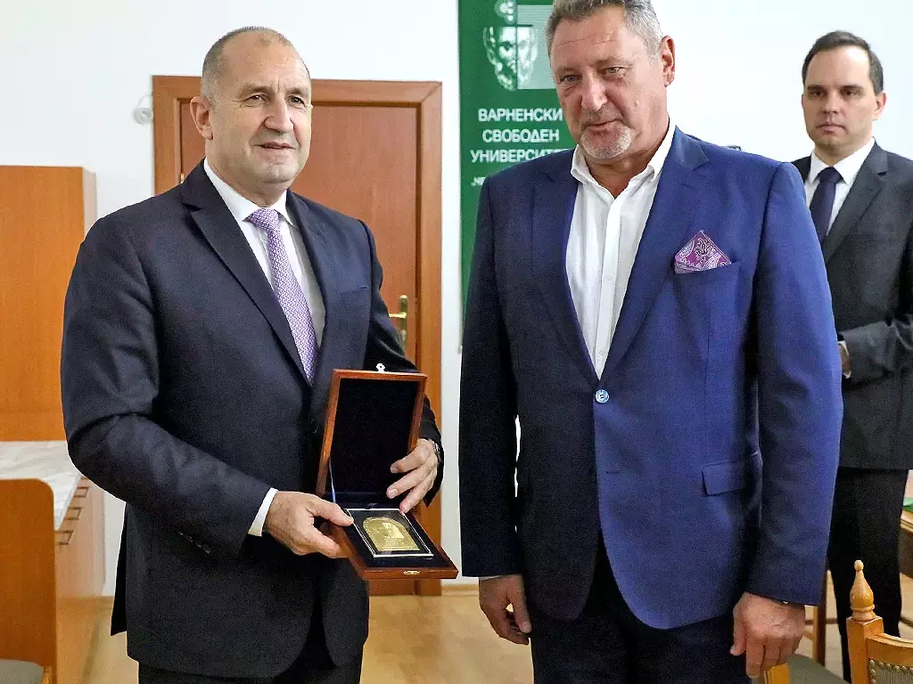 Академичното ръководство връчи на президента Радев златен плакет на Варненския свободен университет.