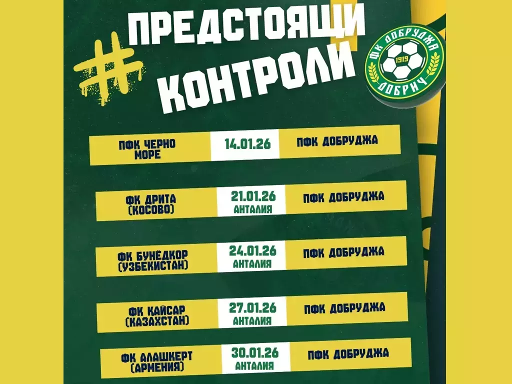 Тимът ще направи първата си тренировка за 2026-а под ръководството на новия треньор на 5 януари (понеделник) от 14 ч. на стадион „Дружба“ в Добрич. В рамките на зимната подготовка Добруджа ще изиграе пет контролни срещи. Първата проверка ще бъде в България срещу Черно море, след което отборът заминава на подготвителен лагер в Анталия, където ще се изиграят останалите контроли. Лагерът в Анталия ще се проведе в периода 18.01 – 31.01.2026 година.